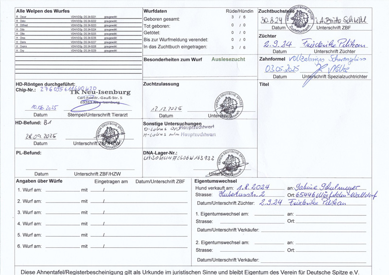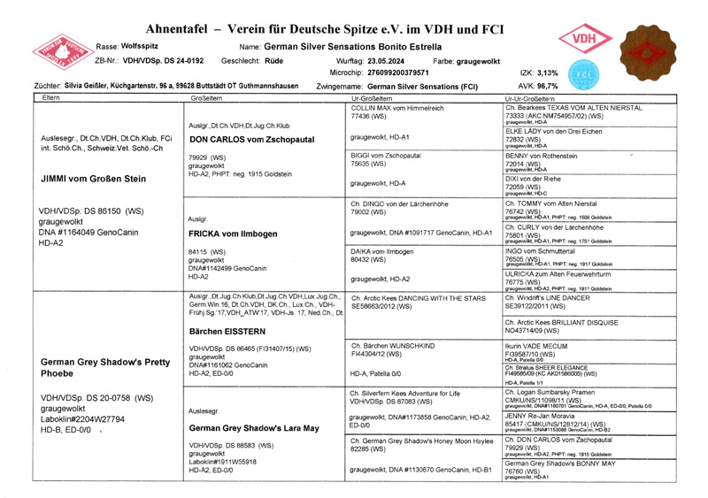 | WONDERFUL WALLACE OVER DE SPITZE HEI WT: 08.11.2023, Auslesegruppe, HD-frei (A), ED 0/0, PL 1/0, D-Lokus D/D, M-Lokus m/m, vollzahniges Scherengebiss, DNA hinterlegt Laboklin Besitzerin: Silvia Geißler Küchgartenstr. 96a D - 99628 Buttstädt OT Guthmannshausen Mobil: +49 (0) 173 - 871 29 36 E-Mail: → info@germansilversensations.de Internet: → www.germansilversensations.de ![]() ![]() |