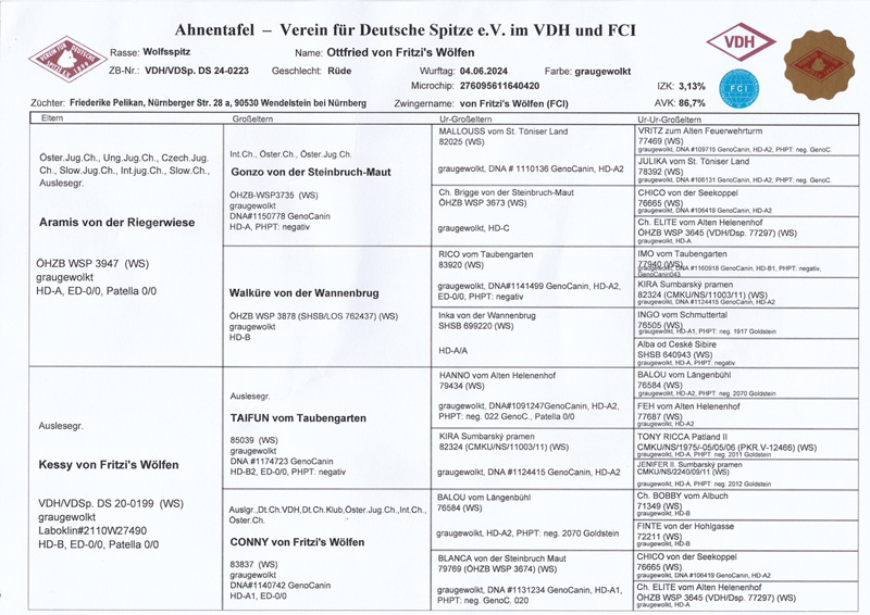 | Olf von der Wannenbrugg WT: 17.05.2015 - HD-frei A/A - PHPT-negativ - SHSB 734976 Besitzer: Bernadette Sutter Lerchenstraße 10a CH - 9304 Bernhardzell Tel. +41 - 71 433 21 34 E-Mail: → bernadette-sutter@bluewin.ch Internet: → www.wannenbruggs-wolfsspitze.ch |