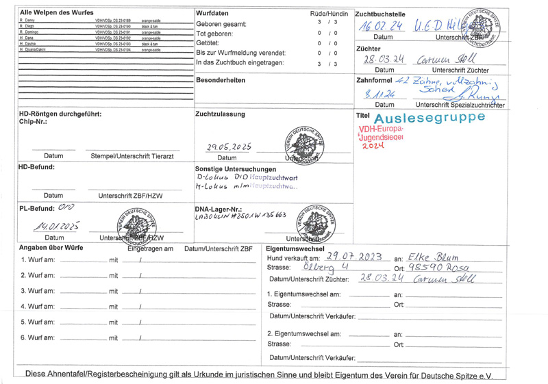 RATHSZUNFT WT: 30.04.2020 - PL 0/0 - DNA hinterlegt - Farbe: 6/graugewolkt - Auslesegruppe - Dt. Champ. VfDSp. - Luxemb. Champ. - Vereinssieger 2025 Besitzer: Annette Riexinger Im Denzler 9 D - 74226 Nordheim Mobil: +49 (0) 178 - 435 24 18 E-Mail: → annette.riexinger@web.de |